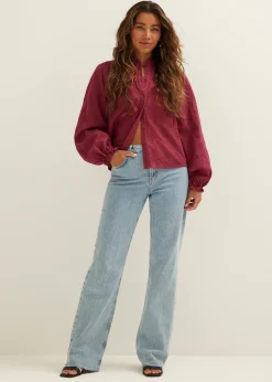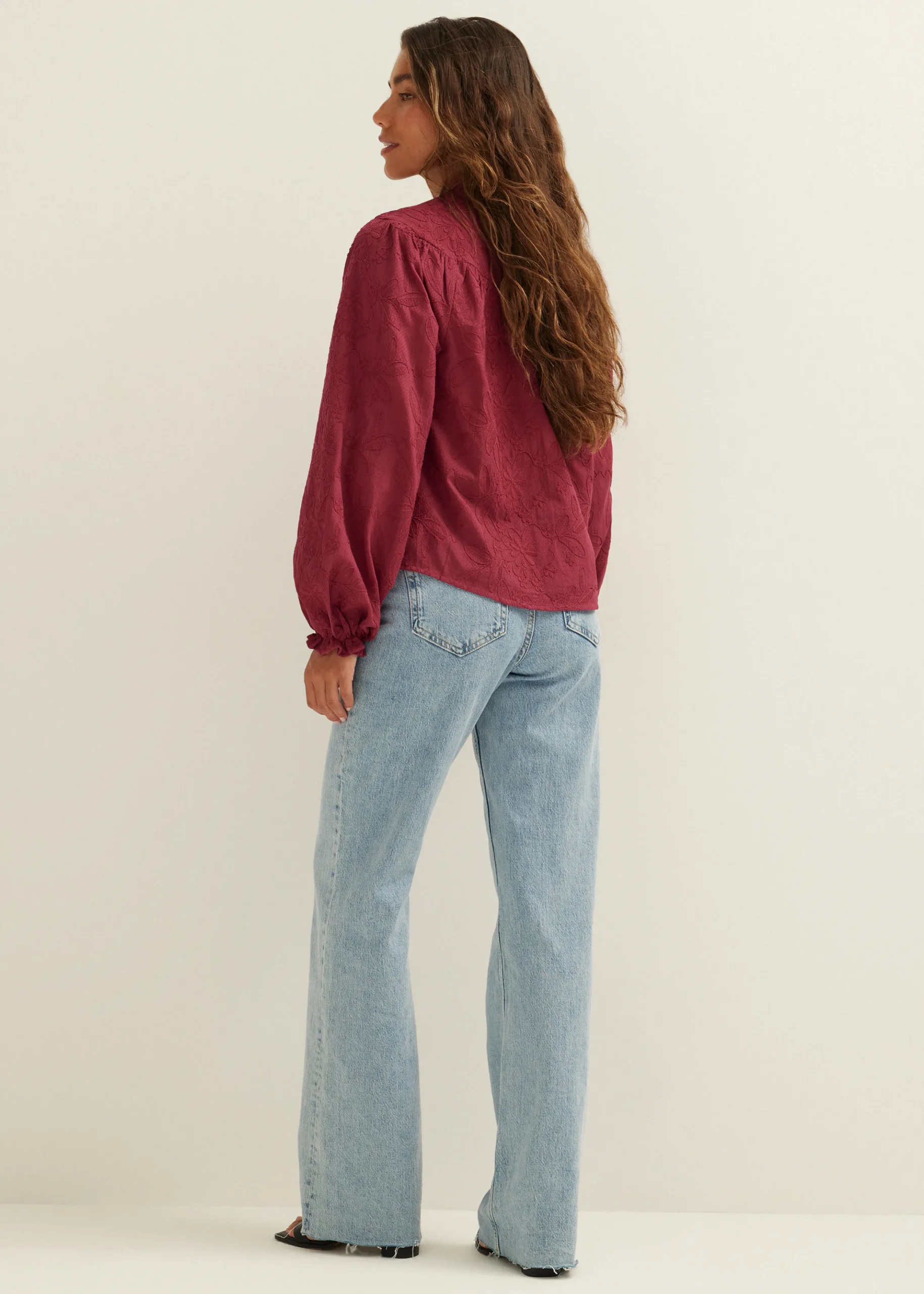 De blouse heeft een jacquard geweven bloemen patroon, lange mouwen, een ronde hals en een knoopsluiting. Aan de hals en de mouwzoom zijn ruffles bevestigd. Let op! Voor de perfecte pasvorm adviseren wij een maat kleiner.