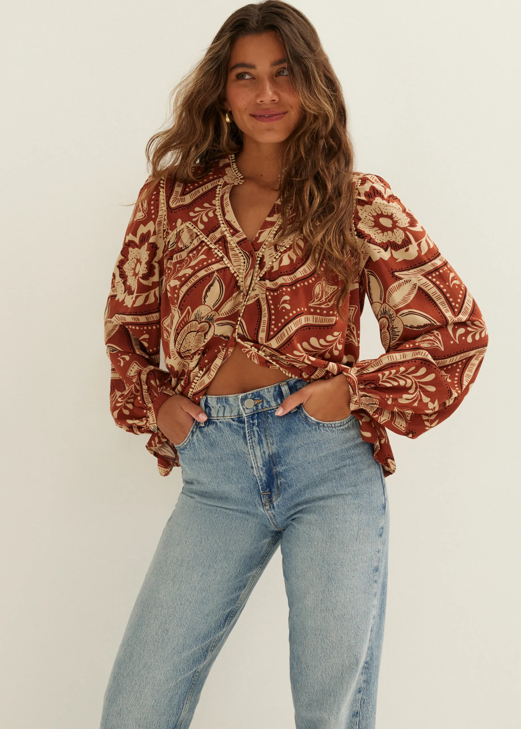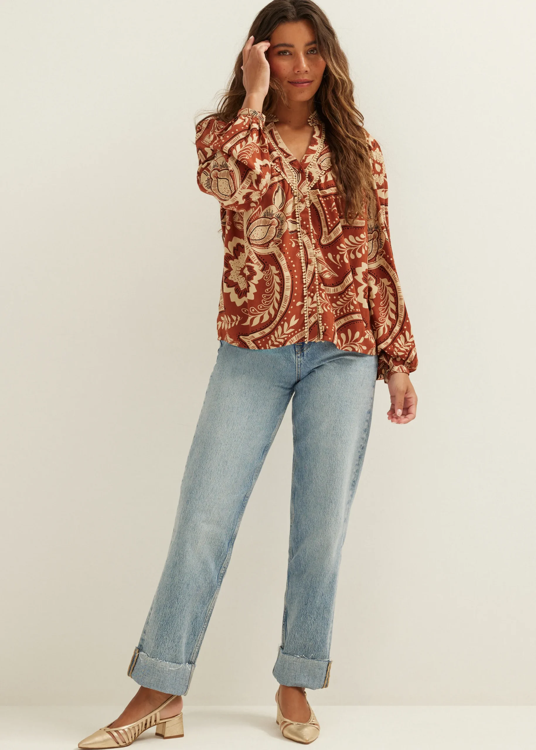 De blouse met print heeft lange mouwen, een v-hals en een knoopsluiting. Aan de halslijn, mouwzoom en onderkant van de blouse is een boord bevestigd. Deze blouse wordt gekenmerkt door de all-over print en de tape details die zijn verwerkt in verschillende siernaden van de blouse. Let op! Voor de perfecte pasvorm adviseren wij een maat kleiner.