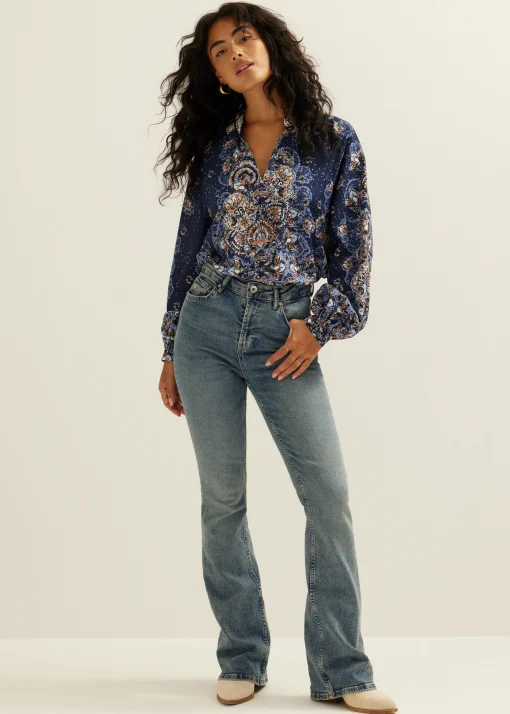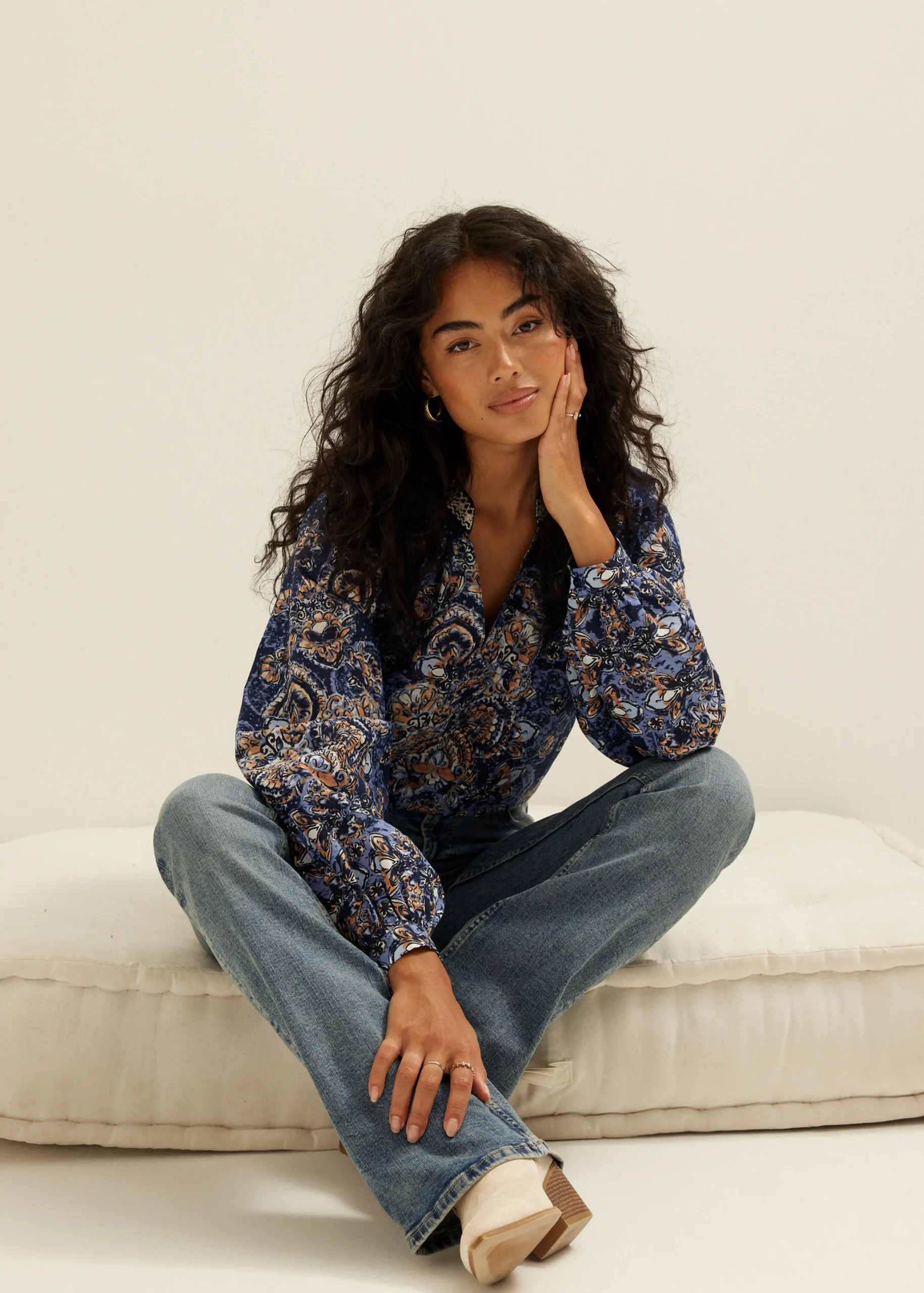Crochet top met lange mouwen en een v-hals. De top is voorzien van een all-over print en crochet details.