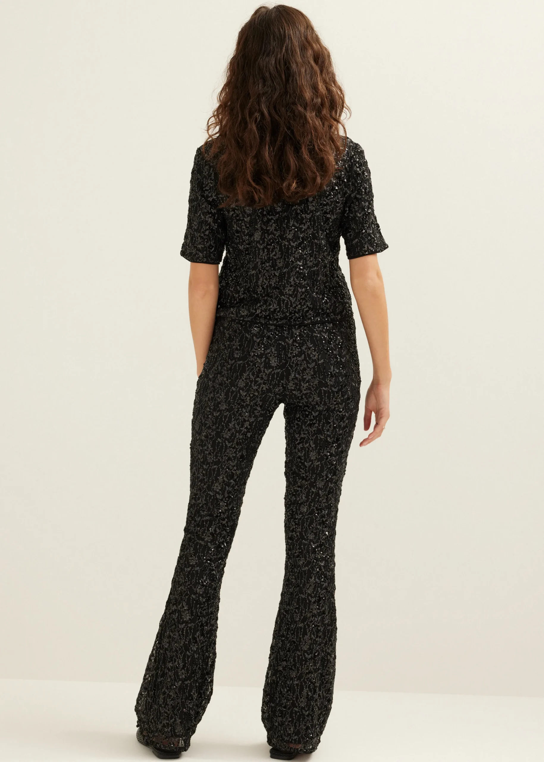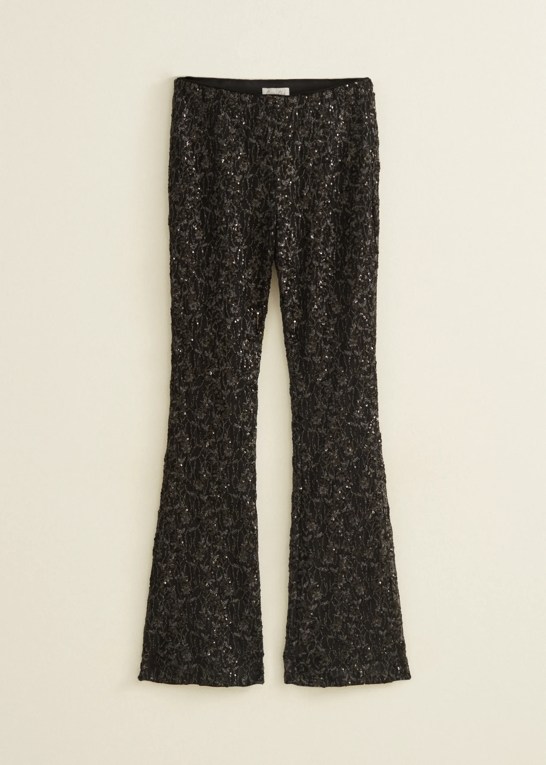 Flared broek met pailletten geborduurd in een bloemen patroon. De broek heeft een hoge taille en een elastische tailleband. Deze flared broek is gemaakt van een mesh kwaliteit stof voorzien van een borduurwerk met pailletten en lurex draad. Aan de binnenkant is de broek gevoerd zodat deze comfortabel draagt en niet doorschijnt.