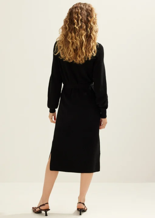 Gebreide jurk met lange mouwen, een col en aan beide kanten een korte split. De jurk is voorzien van een bijpassende ceintuur en heeft een rib structuur. Deze jurk heeft een midi lengte en een boord aan de onderkant van de mouw. Let op! Voor de perfecte pasvorm adviseren wij een maat kleiner