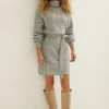 De jurk is van een gebreide geribde stof, heeft een col en lenge mouwen. Om de taille te accentueren heeft de jurk een strik ceintuur. Let op! Voor de perfecte pasvorm adviseren we een maat kleiner.