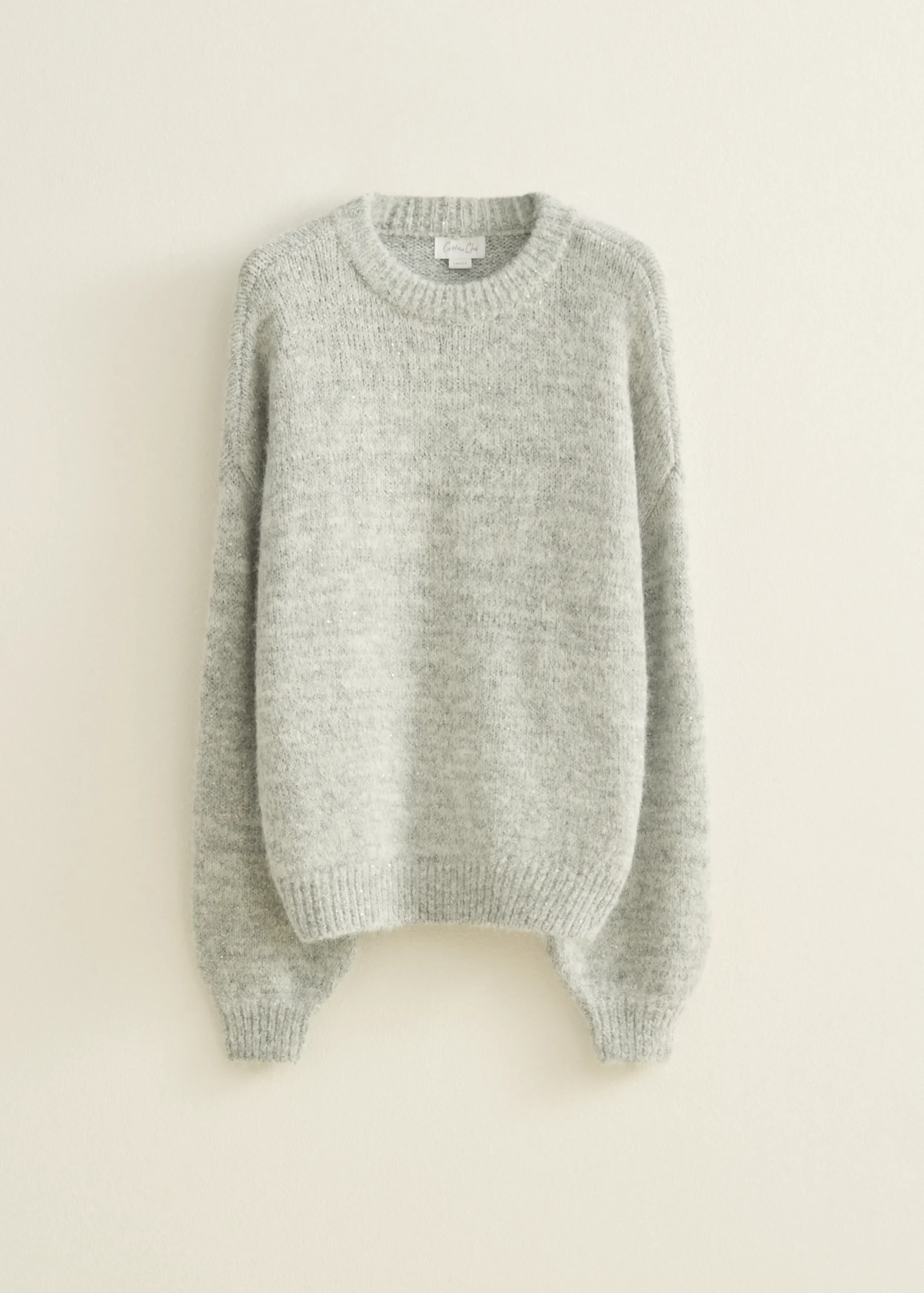 De gebreide trui heeft lange mouwen en een ronde hals. De trui wordt gekenmerkt door de harige structuur en de pailletten die zijn verwerkt in het breisel. Aan de onderkant van de trui, de mouwen en bij de hals is een rekbaar boord bevestigd.