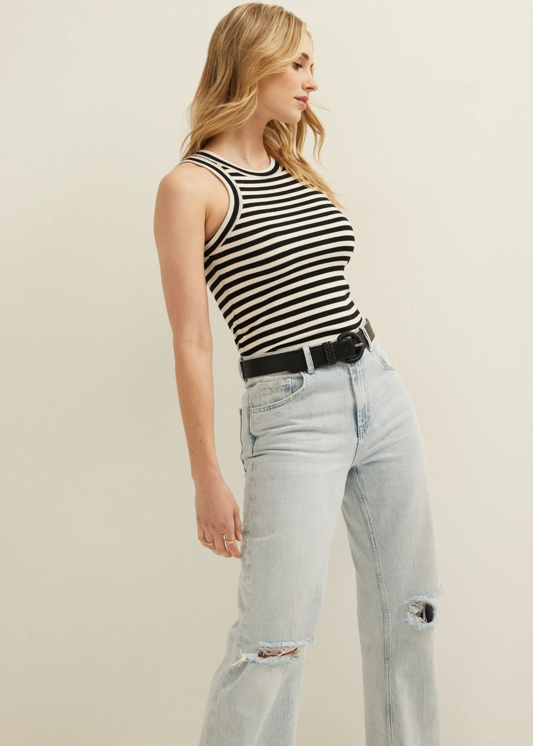 Dit singlet wordt gekenmerkt door de gestreepte print en de rib structuur die is verwerkt in de stof. Het singlet heeft een ronde hals en een aansluitende pasvorm.