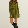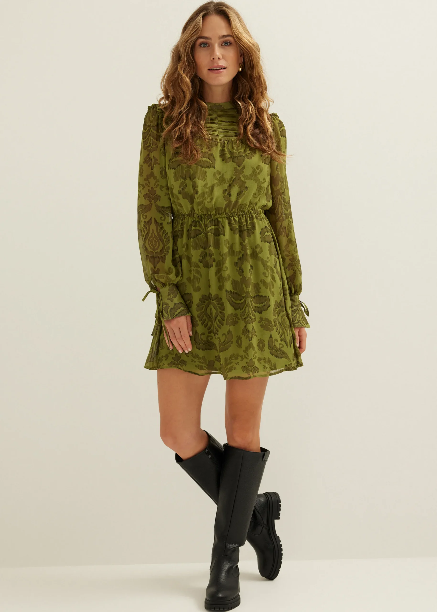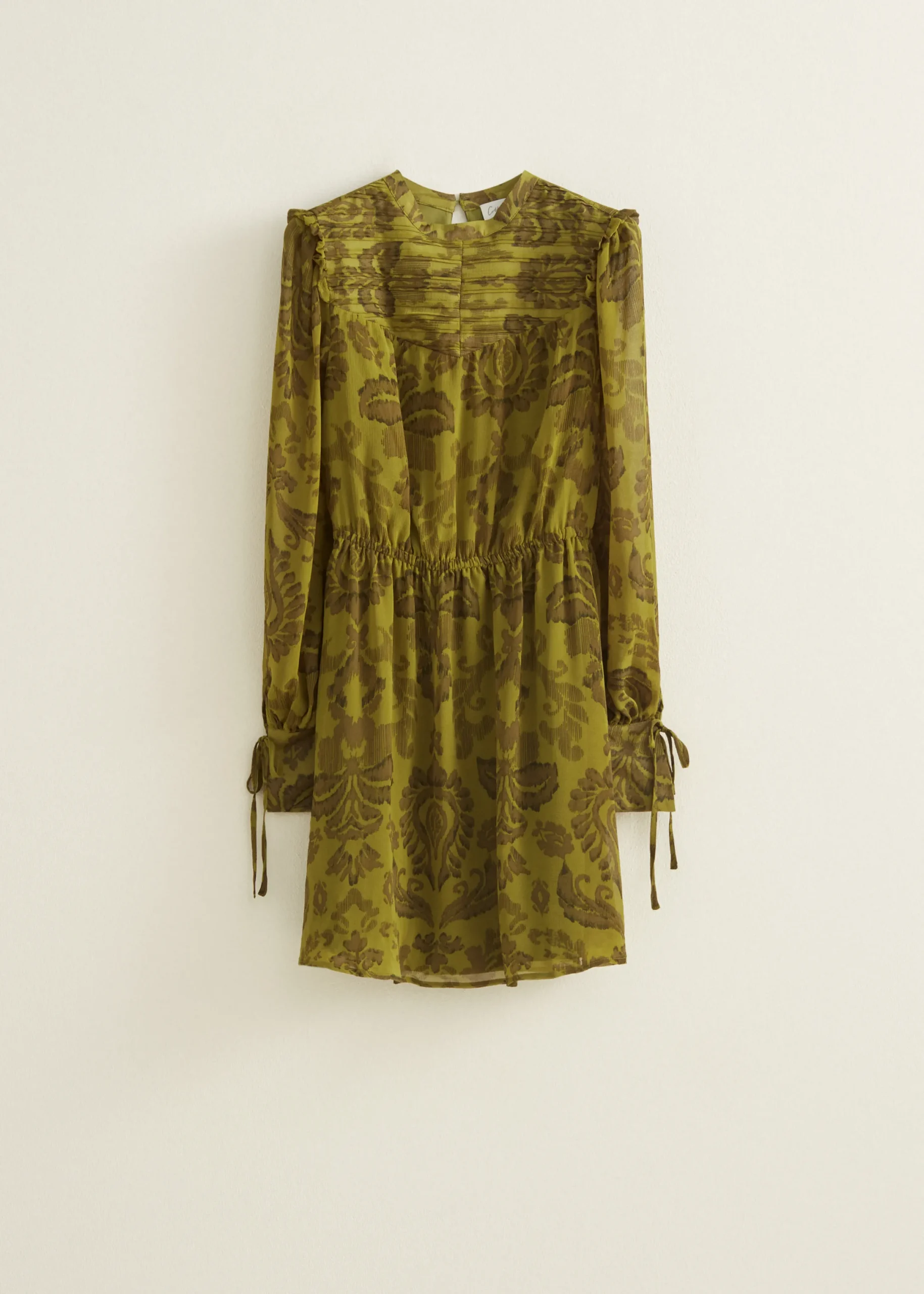 Mini jurk met lange mouwen, een ronde hals en een a-lijn model. In de taille heeft de jurk een elastische band en in de nek sluit de jurk met een knoopje. De jurk is gemaakt van een chiffon stof met print en voorzien van een onderjurk. De mini jurk heeft geplooide details en ruches bij de hals en een koordje bij de pols waardoor je de mouw strakker kan maken.