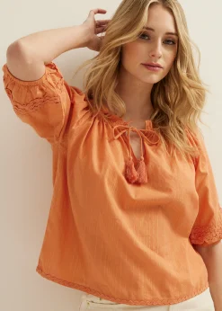 Deze oranje top heeft half lange mouwen en een ronde halslijn met elastiek. Bij de hals zijn koordjes bevestigd die je kan strikken of los kan laten hangen. Aan de koordjes zijn kwastjes bevestigd voor een speels effect. Aan de zoom van de top en op de mouwen zijn gehaakte tape details bevestigd. De stof van de top bevat een gouden lurex draad.