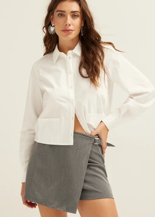 Skort met overslag aan de voorzijde en een ritssluiting aan de achterkant. De overslag van de skort sluit met een riempje. Deze skort is beschikbaar in drie kleuren.
