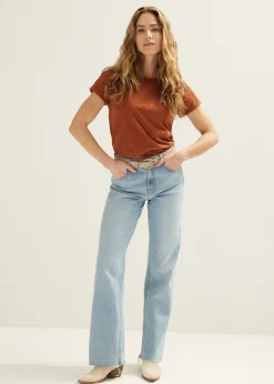 Basic T-shirt met een ronde hals en korte, opgerolde mouwen. Het t-shirt heeft een losse pasvorm en verlaagde schoudernaden. Let op! Voor de perfecte pasvorm adviseren wij een maat kleiner
