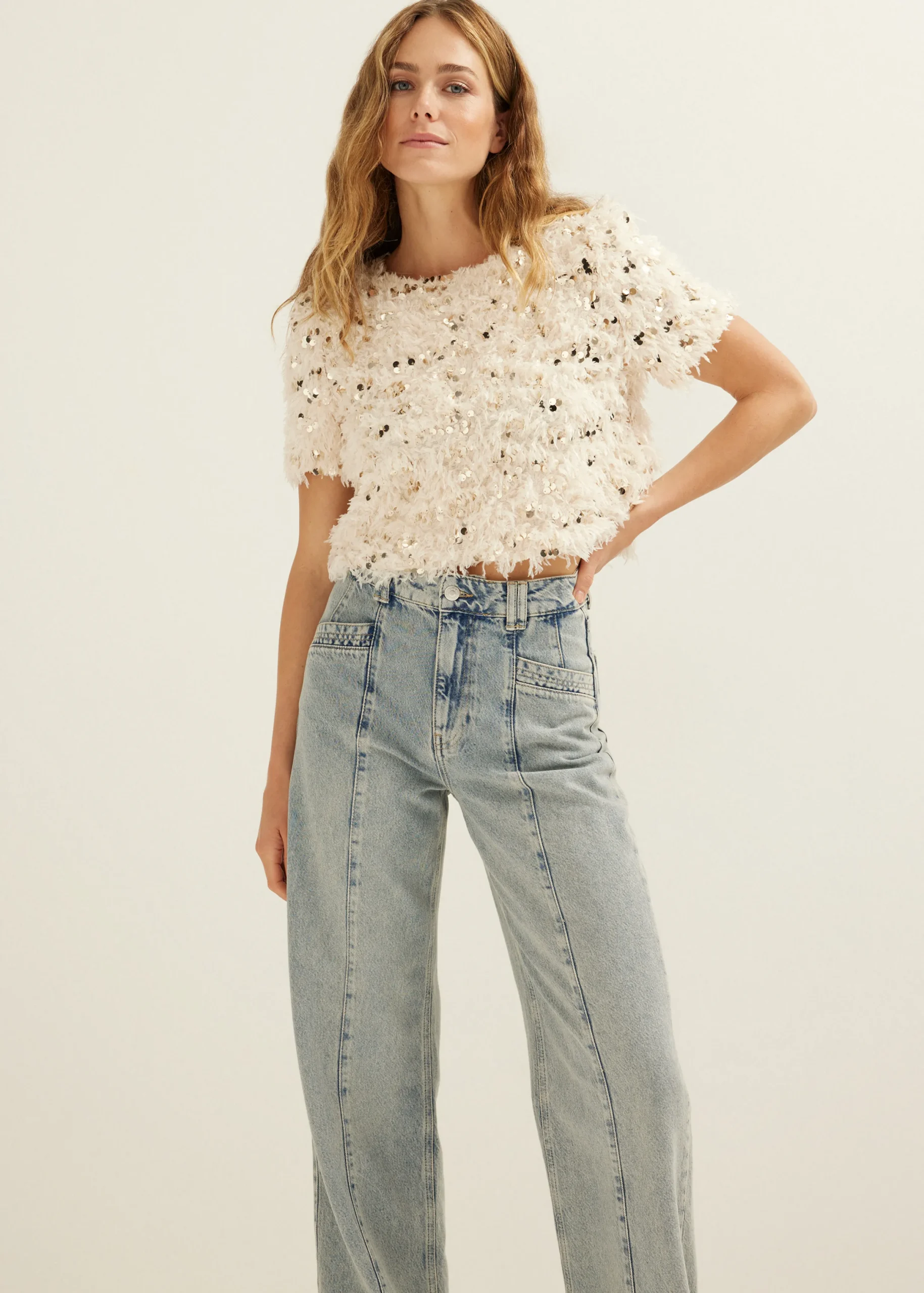 Het t-shirt heeft korte mouwen, een ronde hals en sluit met een knoopje in de nek. Dit t-shirt heeft een kort model en is verrijkt met veren en pailletten. Let op! Wij adviseren een maat groter voor de perfecte pasvorm.
