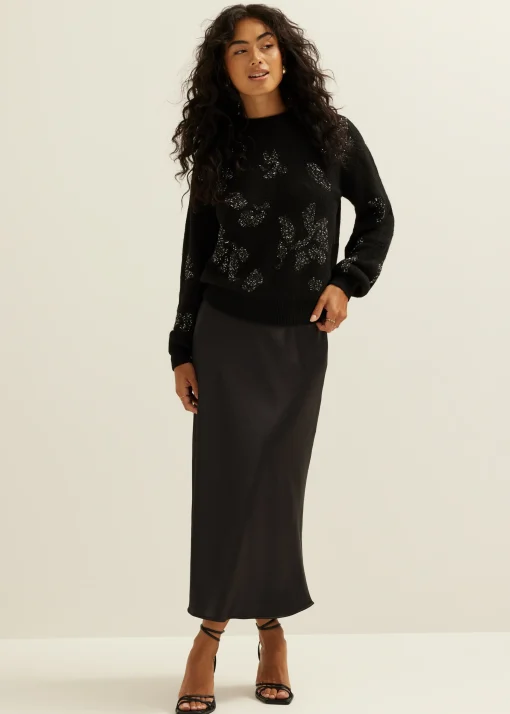 Trui met een borduurwerk van pailletten. De trui heeft lange mouwen, een ronde hals, een reguliere pasvorm en is van een gebreid materiaal gemaakt. Aan de onderkant van de trui, bij de mouwen en de hals is de trui voorzien van een geribd boord.