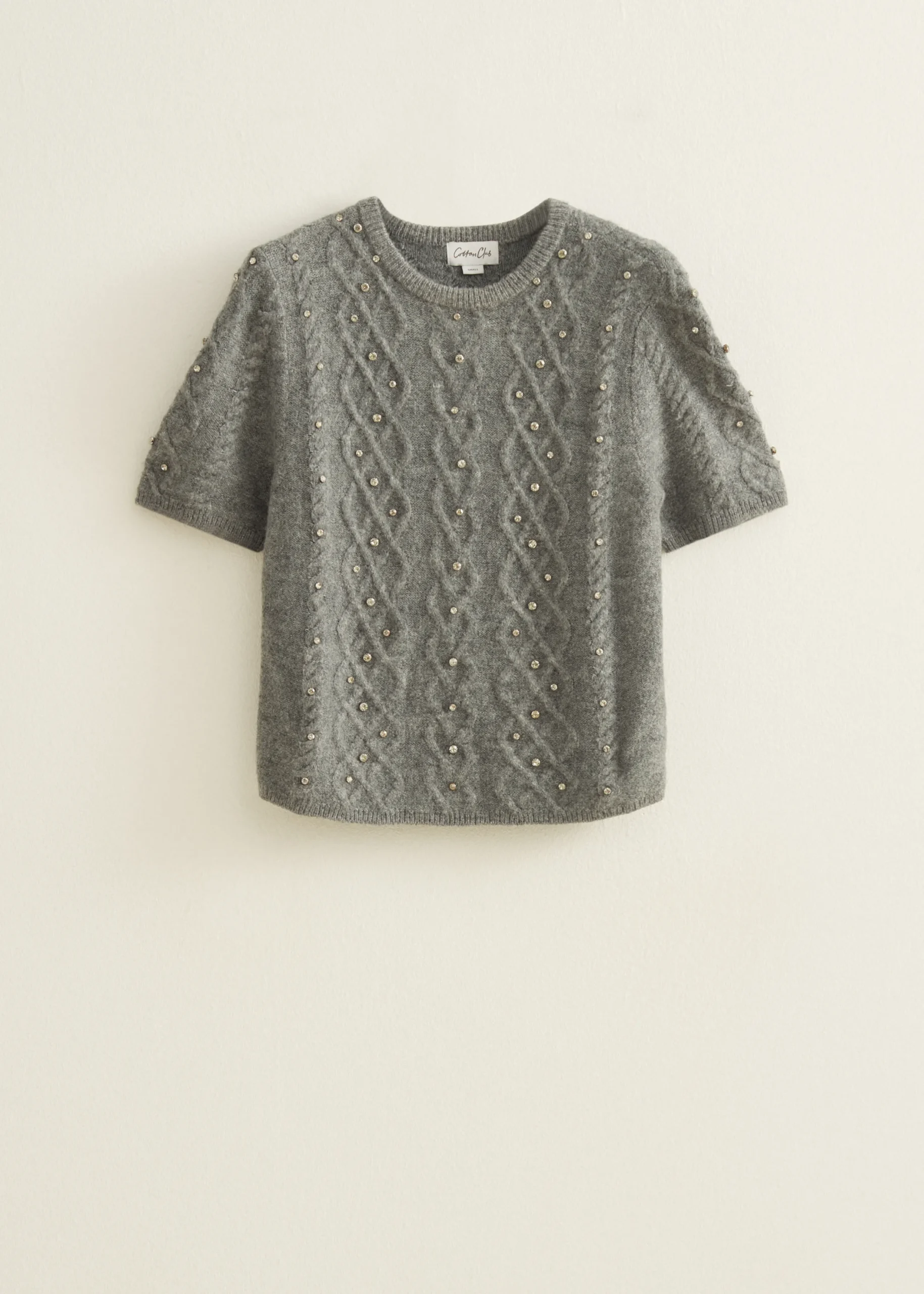 De trui heeft korte mouwen, een ronde hals en een gebreid kabelpatroon. De trui wordt gekenmerkt door de kleine strass steentjes op de voorkant.