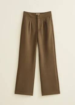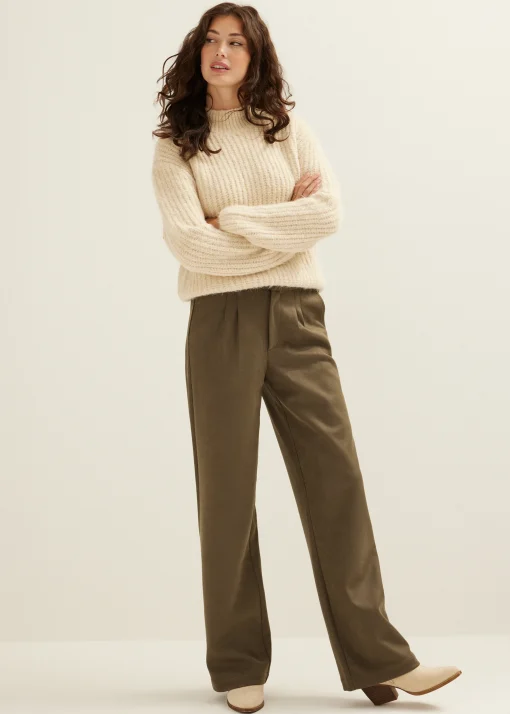 Wijde broek van jersey kwaliteit met hoge taille. De broek heeft een schuif- en ritssluiting, twee steekzakken aan voorkant en twee (nep)paspelzakken aan de achterkant. Aan de voorzijde is de broek voorzien van geplooide details die zorgen dat de broek mooi past. De broek heeft een zachte twill structuur. Combineer de wijde broek met een blouse voor een verfijnde look.