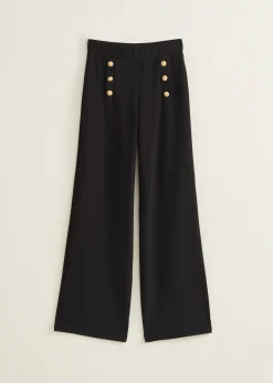 Wijde broek met goudkleurige knopen, een hoge taille en wijde broekspijpen. De broek heeft een elastische tailleband.