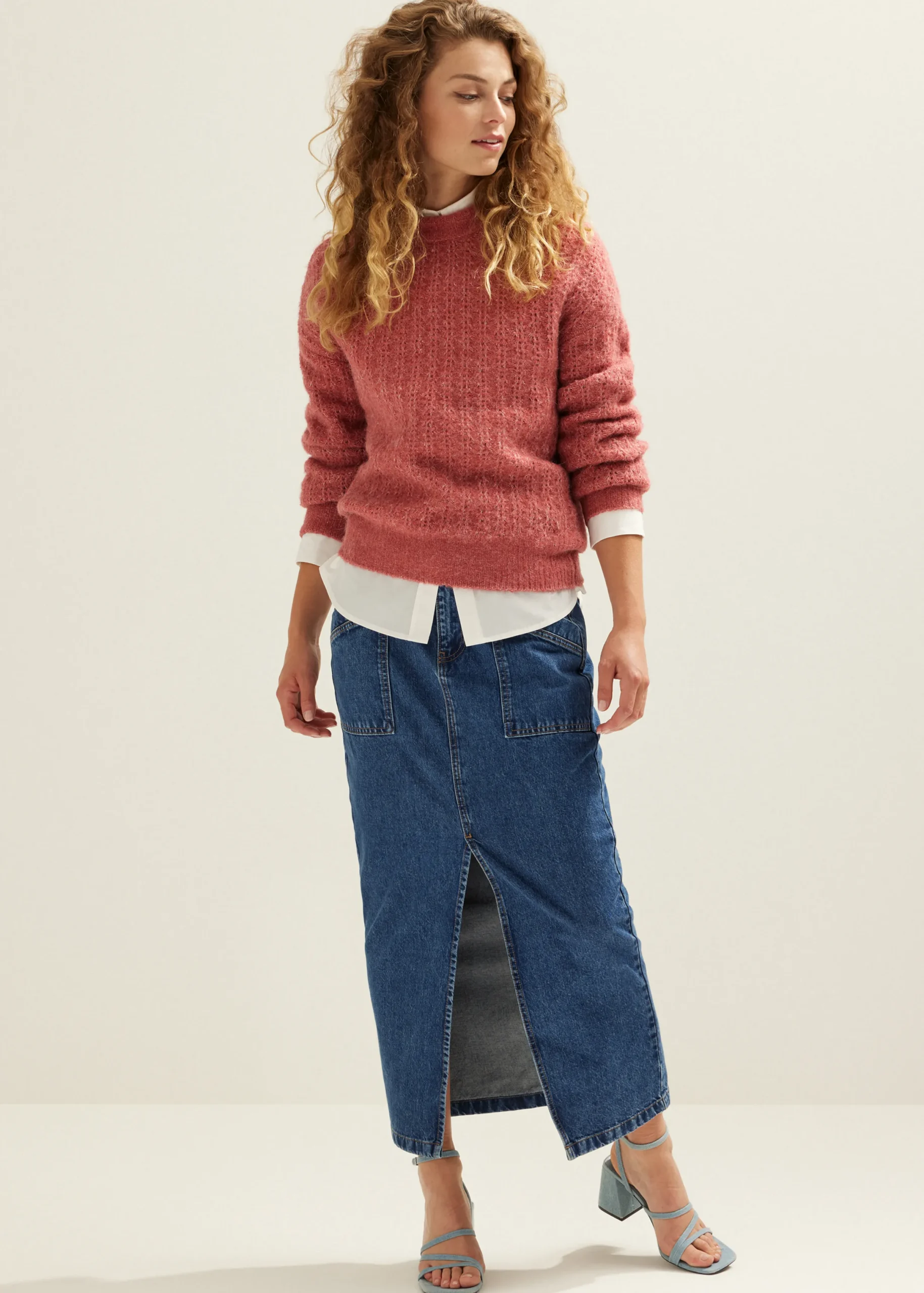 De trui heeft is gebreid en heeft een hairy zachte structuur. Deze trui is voorzien van lange mouwen, een ronde hals en heeft een reguliere pasvorm. Verder heeft de trui een geribbeld boord aan de onderkant, bij de hals en de onderkant van de mouwen. Let op! Wij adviseren een maat groter voor de perfecte pasvorm.