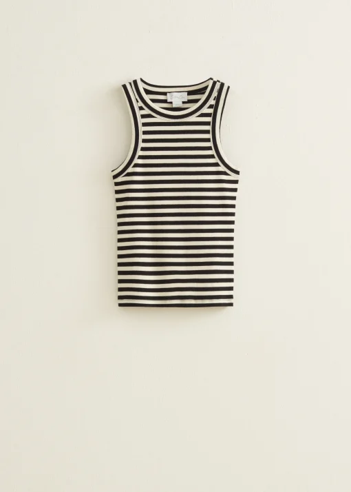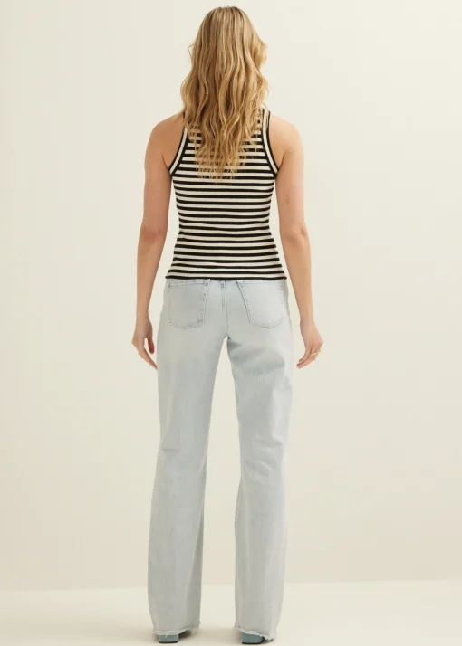 Dit singlet wordt gekenmerkt door de gestreepte print en de rib structuur die is verwerkt in de stof. Het singlet heeft een ronde hals en een aansluitende pasvorm.