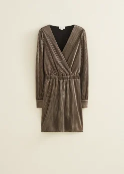 Mini jurk van plissé kwaliteit. De mini jurk heeft een v-hals, lange mouwen met geplooide details bij de schouder en een elastische band in de taille. Het bovenste deel van de jurk heeft een overslag en aan de binnenkant is de jurk gevoerd. Deze mini jurk van plissé is beschikbaar in drie kleuren. Let op! Voor de perfecte pasvorm adviseren wij een maat kleiner.