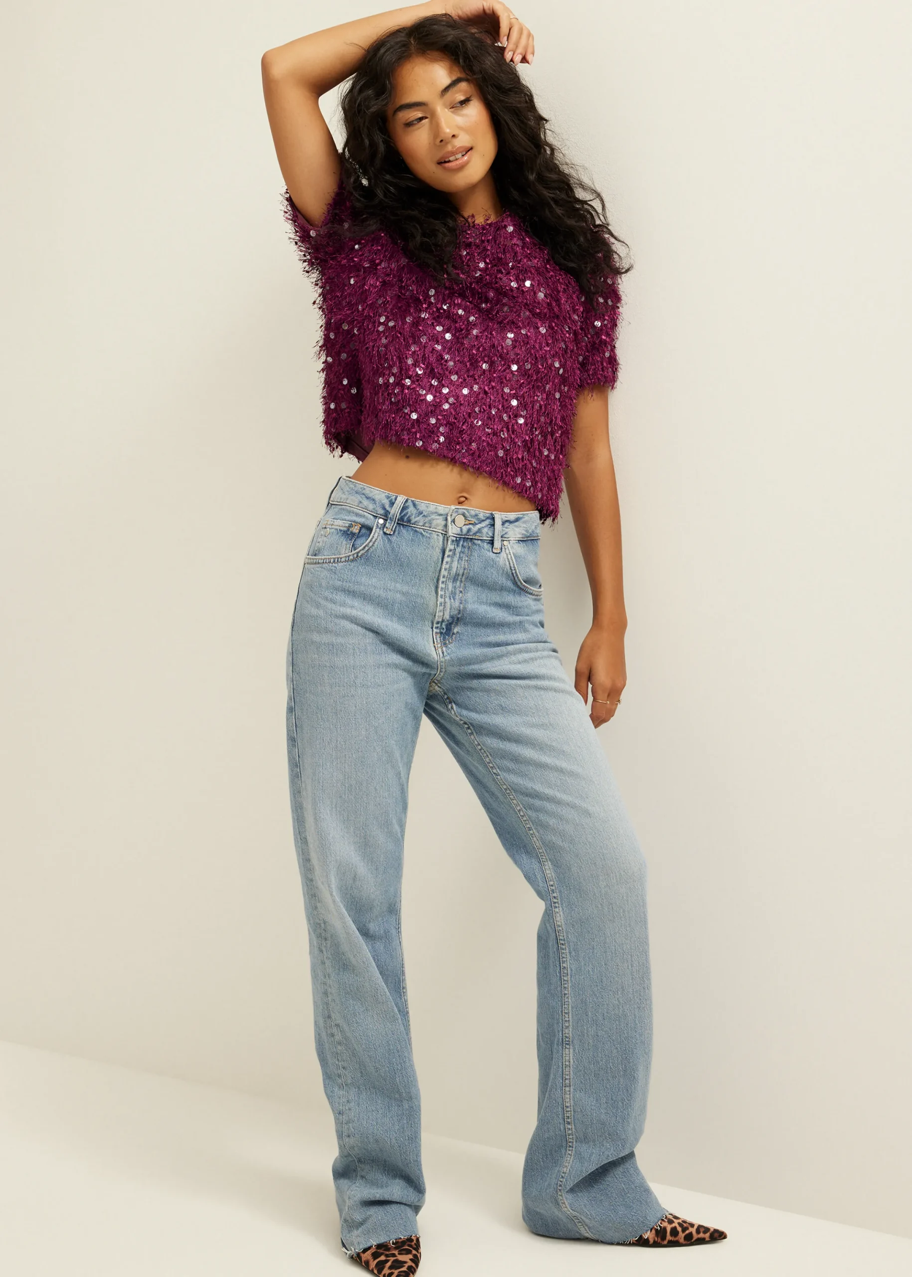 Pailletten top met fringes, korte mouwen en een ronde hals. De top valt kort, heeft een reguliere pasvorm en is voorzien van pailletten en fringes. Aan de binnenkant is deze top gevoerd zodat deze comfortabel voelt op de huid tijdens het dragen. De perfecte top voor het party seizoen. Let op! Voor de perfecte pasvorm adviseren wij een maat groter.