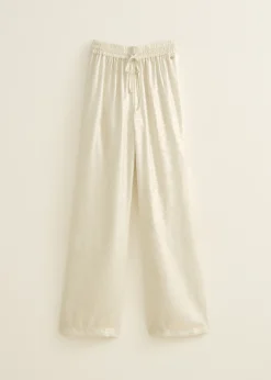 Deze palazzo broek heeft een elastische tailleband met striksluiting en wordt gekenmerkt door de hoge taille en wijde broekspijpen. De broek heeft een champagne kleur en een glanzend effect.
