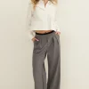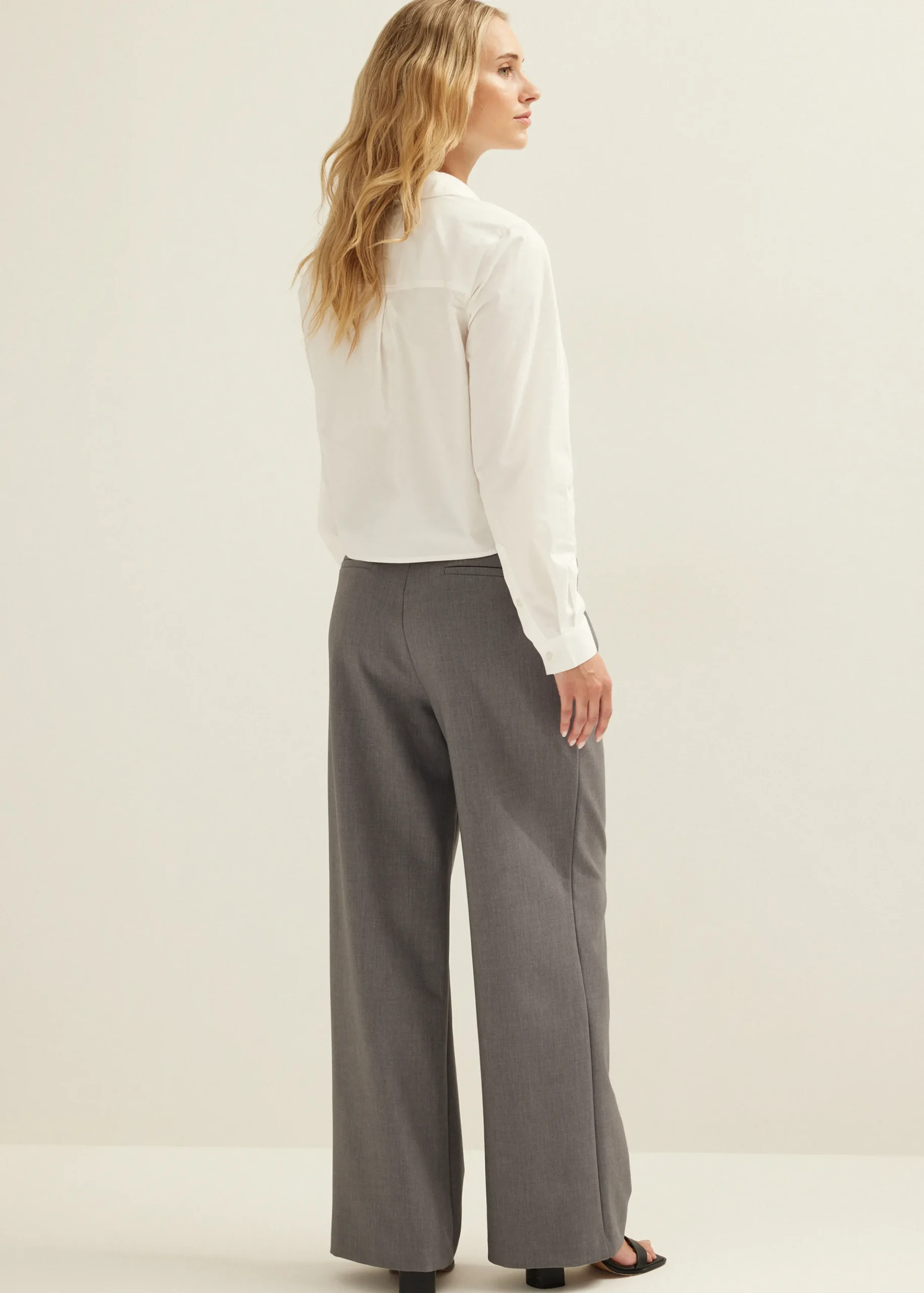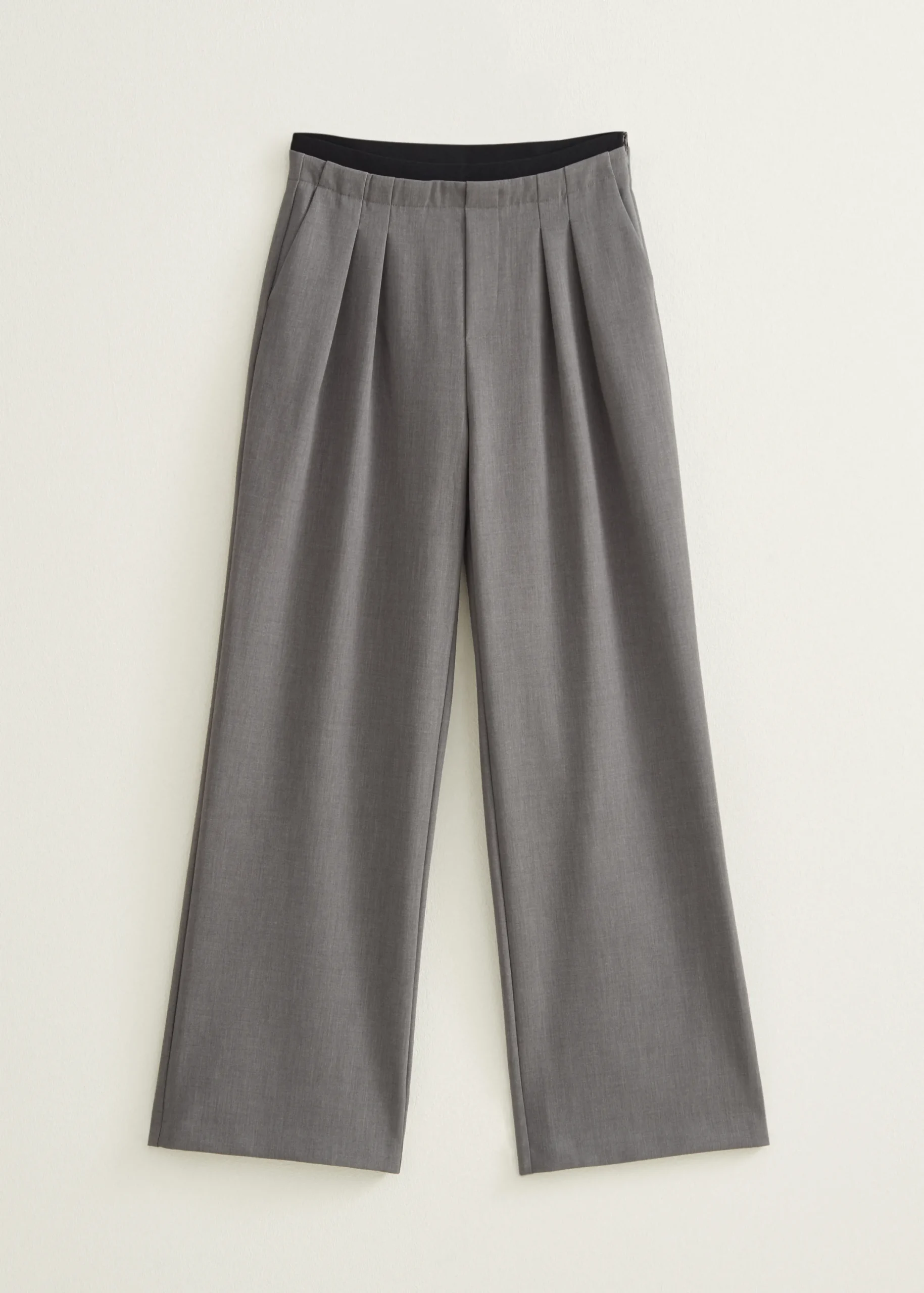 De pantalon heeft een wide leg model, een hoge taille en een elastische tailleband die boven de broekrand uitsteekt. Aan de voorkant heeft de pantalon twee steekzakken, twee plooi details en aan de achterkant zijn twee paspel zakken verwerkt.