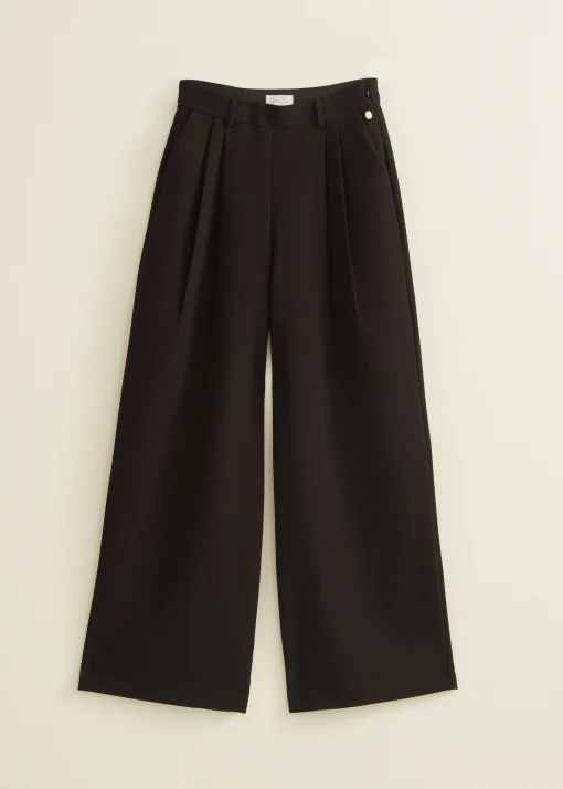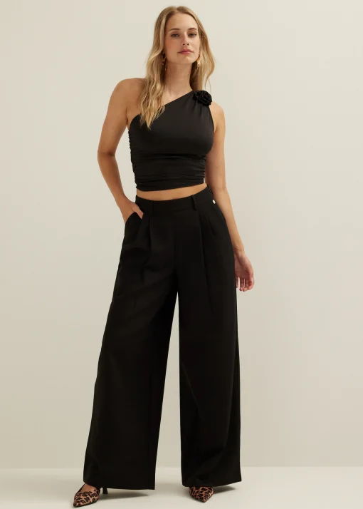Pantalon geplooide details en een wide leg model. De pantalon heeft een hoge taille, twee steekzakken aan de voorzijde en twee (neppe) paspel zakken aan de achterzijde. Deze pantalon heeft een schuifsluiting met gulp en riem lussen de tailleband zodat je de outfit kan stijlen met een leuke riem. Let op! Wij adviseren een maat kleiner voor de perfecte pasvorm.