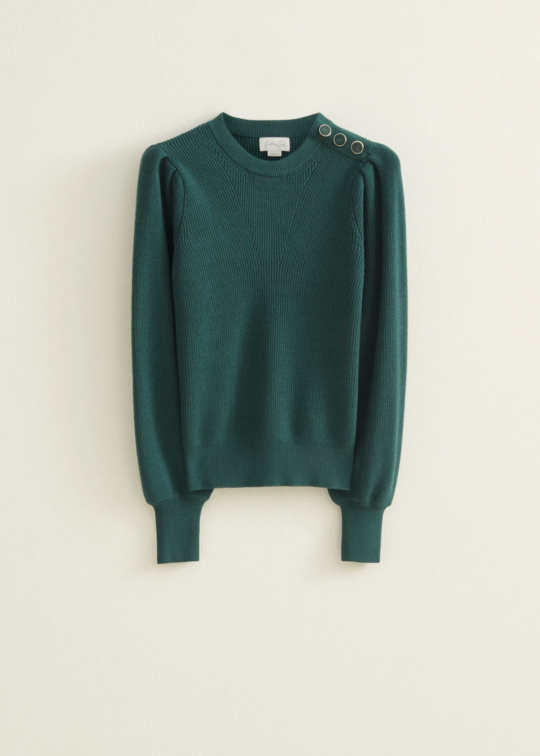 Trui met lange mouwen, een ronde hals en een reguliere pasvorm. De trui is voorzien van knopen bij de rechter schouder en boorden bij de mouwzoom en de hals. De trui is gebreid en heeft een rib structuur. Let op! Voor de perfecte pasvorm adviseren wij een maat groter.