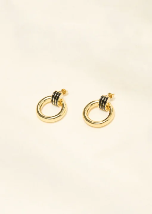 De oorbellen zijn goudkleurig en bestaan uit twee delen; een oorsteker met daaraan bevestigd een ring. Ook bevat de oorbel twee kleuren