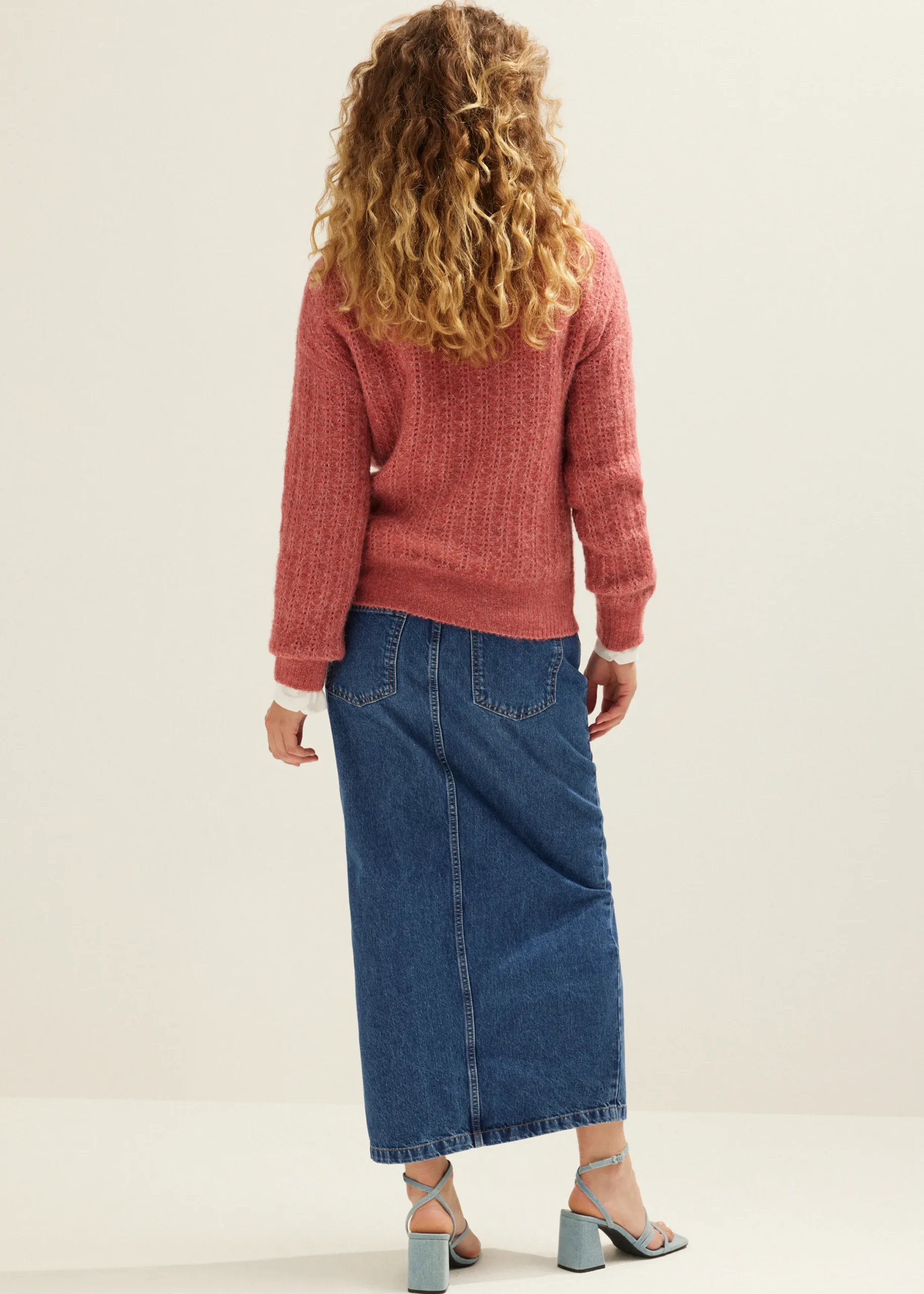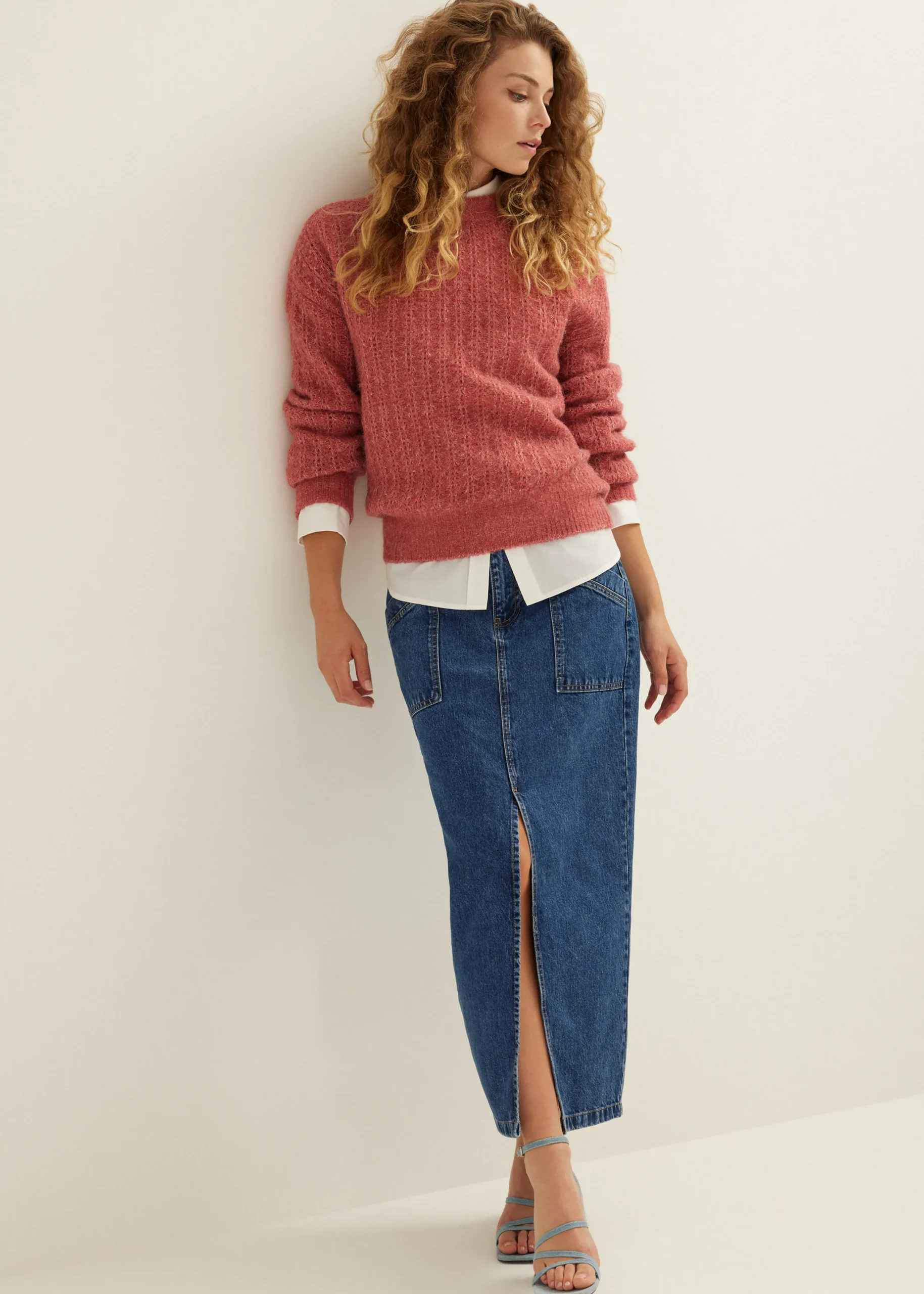 De trui heeft is gebreid en heeft een hairy zachte structuur. Deze trui is voorzien van lange mouwen, een ronde hals en heeft een reguliere pasvorm. Verder heeft de trui een geribbeld boord aan de onderkant, bij de hals en de onderkant van de mouwen. Let op! Wij adviseren een maat groter voor de perfecte pasvorm.
